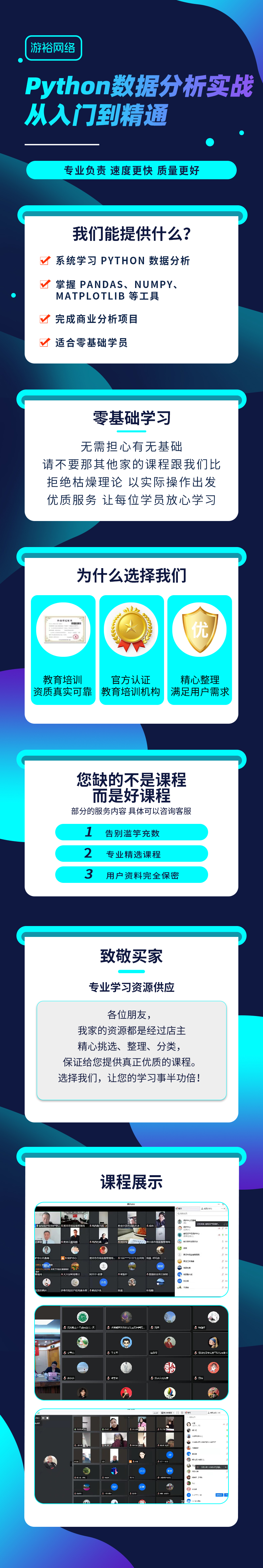 这套Python数据分析教程简直是职场升级利器! 从Pandas数据处理到Matplotlib可视化,再到机器学习实战,案例覆盖电商、金融等热门行业。老师把复杂的统计模型讲得通俗易懂,学完后我做的销售预测模型准确率高达92%,直接帮公司节省了20%库存成本!