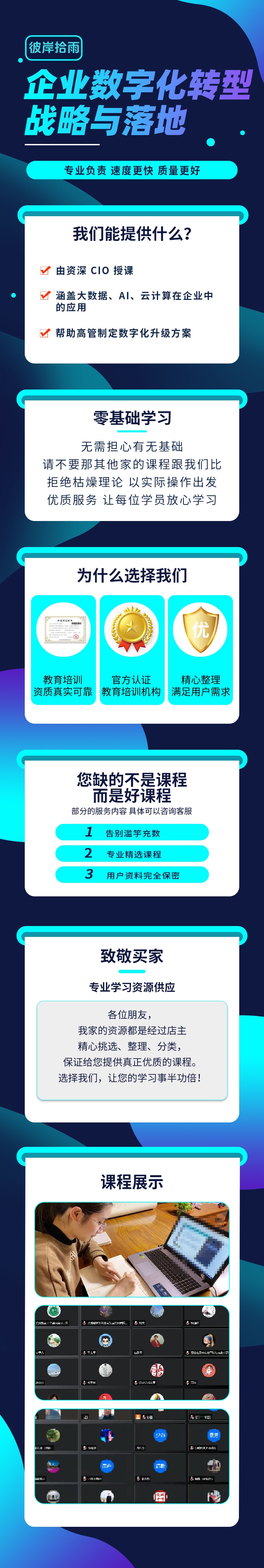 这套课程彻底改变了我们公司的数字化进程! 从顶层设计到实施路径,完整覆盖组织架构调整、技术选型等关键环节。老师分享的"数字化转型成熟度模型"帮助我们精准定位现状,3个月内完成CRM系统升级,客户响应效率提升40%!